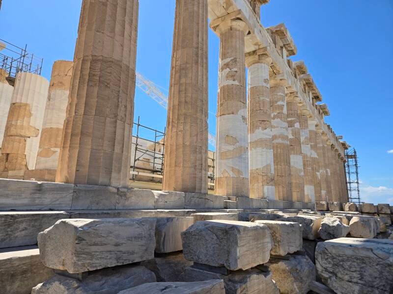 Drugiego dnia zwiedziliśmy Akropolis – patrząc z dołu wydaje się, że wyprawa na górę będzie bardzo długa i męcząca. Tak jednak nie jest – wykupując wycieczkę z przewodnikiem wchodzi się powoli na górę, gdyż co chwilę robione są krótkie przerwy aby opowiedzieć coś o historii Akropolu i Aten. Polecam jednak założenie wygodnych sportowych butów, bo czasem bywa stromo, ślisko i kamieniście. Widzieliśmy kilka osób w klapkach, ale nie wyglądało to zbytnio wygodnie i bezpiecznie. Mała anegdota: nasza przewodniczka opowiadała wszystko po angielsku – co drugie słowo mówiła „lovely” i stwierdziliśmy, że następnym razem trzeba kupić ouzo i popijać za każdym razem jak padnie to słowo. Co nas jeszcze bardziej rozśmieszyło, było to, że Zeus w języku angielskim nazywany jest „ZUS”. Jak to wszyscy Polacy, mięliśmy przynajmniej z czego się pośmiać 😉.
